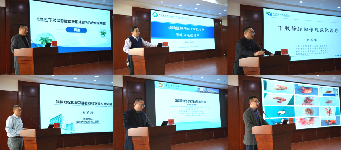学术交流环节,山东省立医院血管外科主任吴学君教授、山东中医药大学第二附属医院副院长王彬教授、中国人民解放军联勤保障部队960医院血管外科主任徐屹立教授、山东大学齐鲁二院血管外科吴梦涛教授、山东省立三院血管外科副主任卢军峰教授、山东省立医院血管外科孔祥骞教授、王茂华教授、周华教授分别围绕“急性主动脉疾病的诊断与药物治疗”“中西医结合治疗糖尿病足”“颈动脉CEA处理策略和经验分享”“静脉取栓支架取栓的利与弊”“下肢静脉曲张的规范化治疗”“急性下肢深静脉血栓形成腔内治疗专家共识”“血管腔内诊疗的基本技术”“肺动静脉瘘的诊疗体会”等题目进行专题讲座,为基层医护人员搭建了高水平学术交流平台,普及了血管疾病规范化诊疗技术,推动新泰市血管外科诊疗技术再上新台阶。